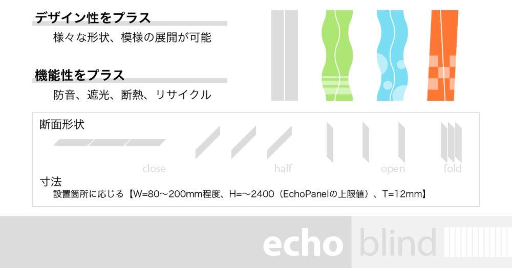 echo blind Product, Concept縦型ブラインドカーテンの素材を厚みのあるEchoPanelに置き換え、 エコロジー性と新しい価値をプラスします。閉じるとフラットになる、波型など直線以外の形状が可能、といった独自の特徴があるプロダクト。 エコ・プロダクツデザインコンペ2008 近畿経済産業局長賞 受賞Share.PREVNEXT